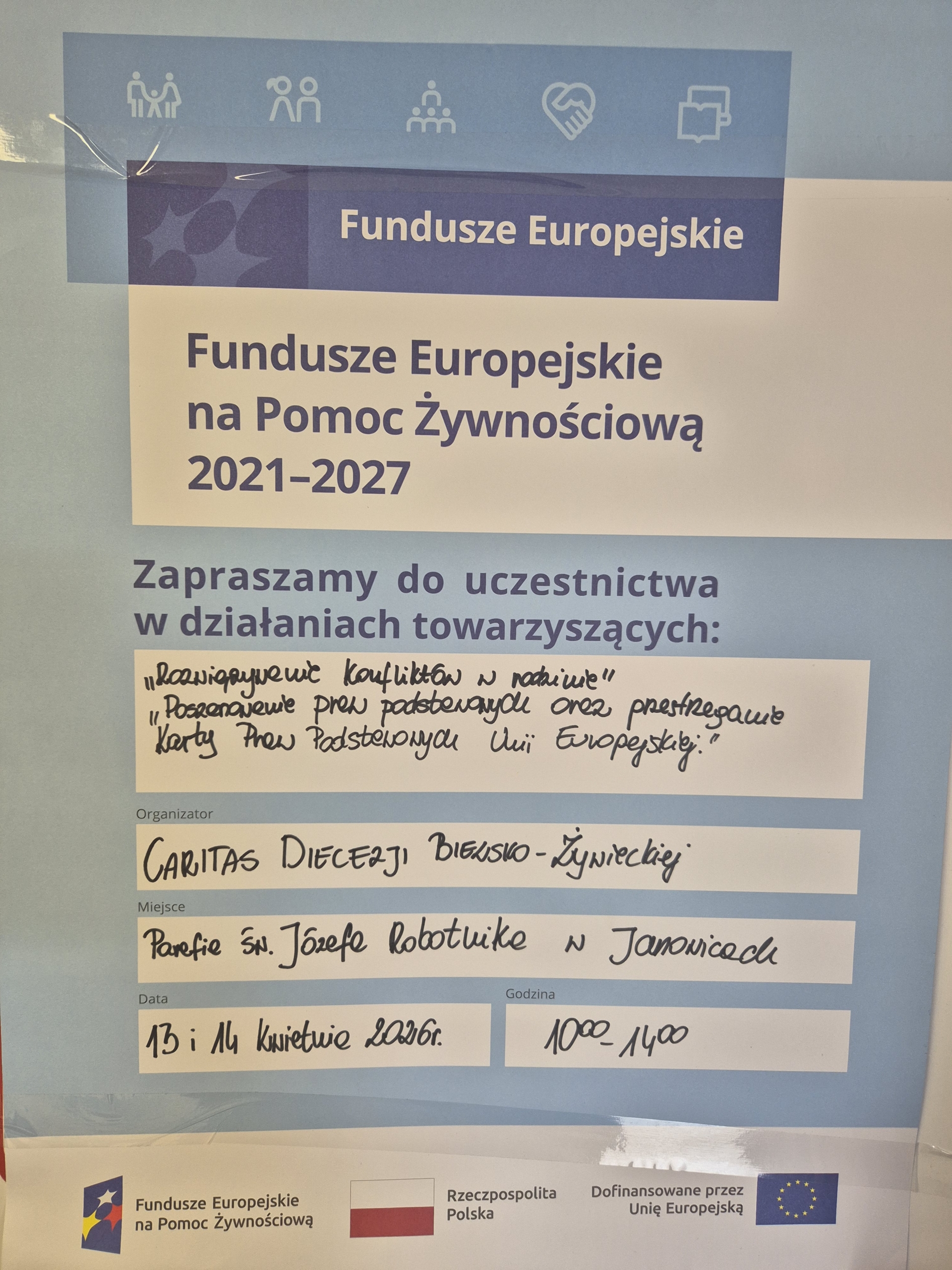 W dniach 13 i 14 kwietnia br. w parafii św. Józefa Robotnika w Janowicach, odbyły się warsztaty skierowane do beneficjentów programu Fundusze Europejskie na Pomoc Żywnościową.